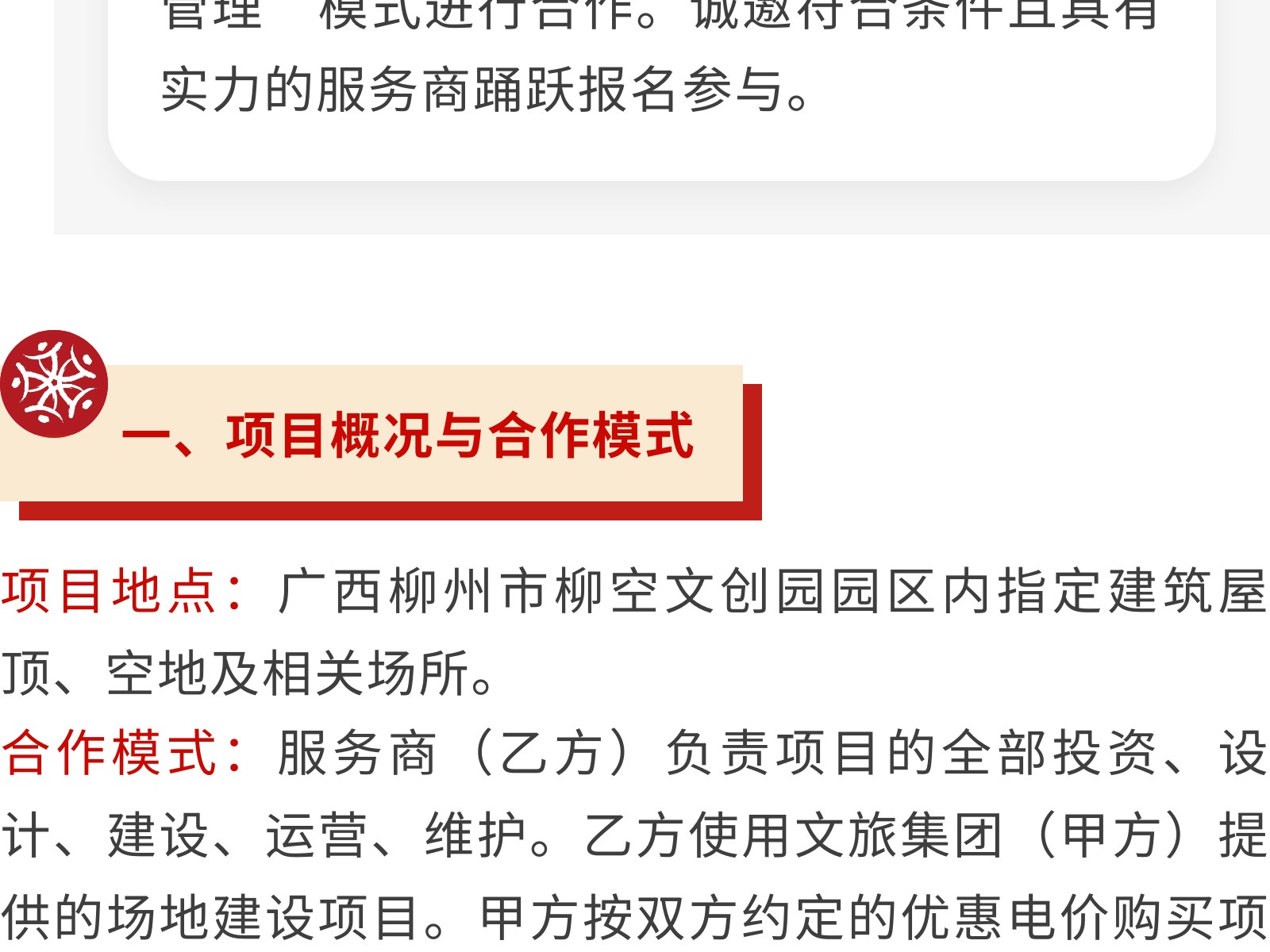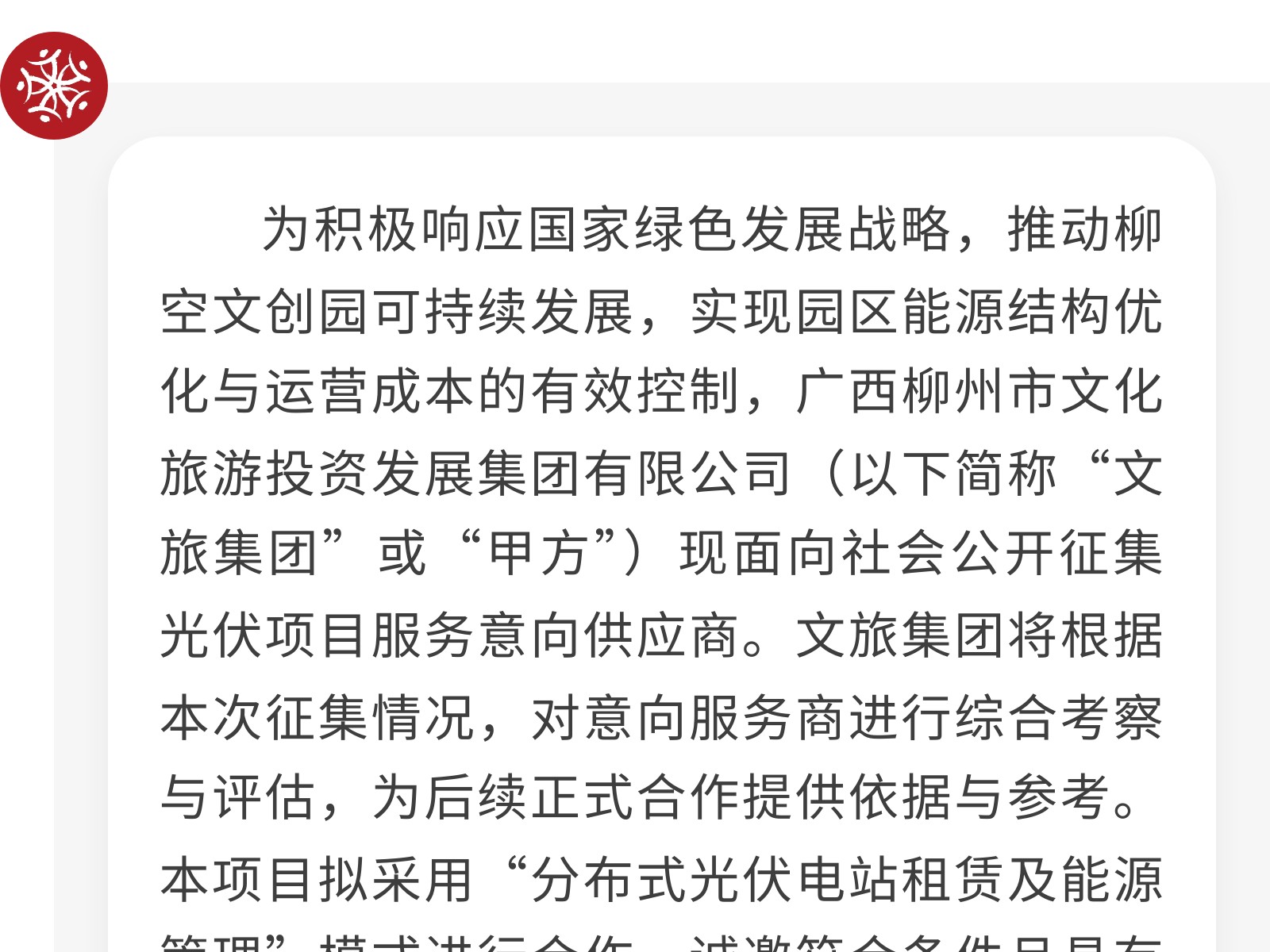 广西柳州市文化旅游投资发展集团有限公司关于为柳空文创园公开招募光伏项目意向服务商的公告